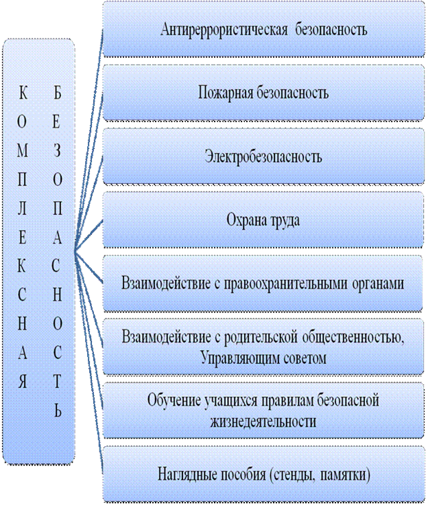 Система комплексной безопасности подразумевает состояние защищенности образовательного учреждения от реальных и прогнозируемых угроз социального, техногенного и природного характера, обеспечивающее его безопасное функционирование. Поэтому нет важнее задачи для образовательного учреждения, чем обеспечение безопасных условий проведения учебно-воспитательного процесса, которые предполагают гарантии сохранения жизни и здоровья учащихся.