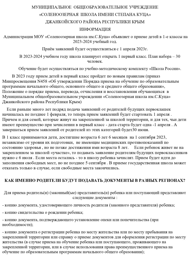 Муниципальное общеобразовательное учреждение "Соленоозерная школа имени Степана Куца" Джанкойского района Республики Крым